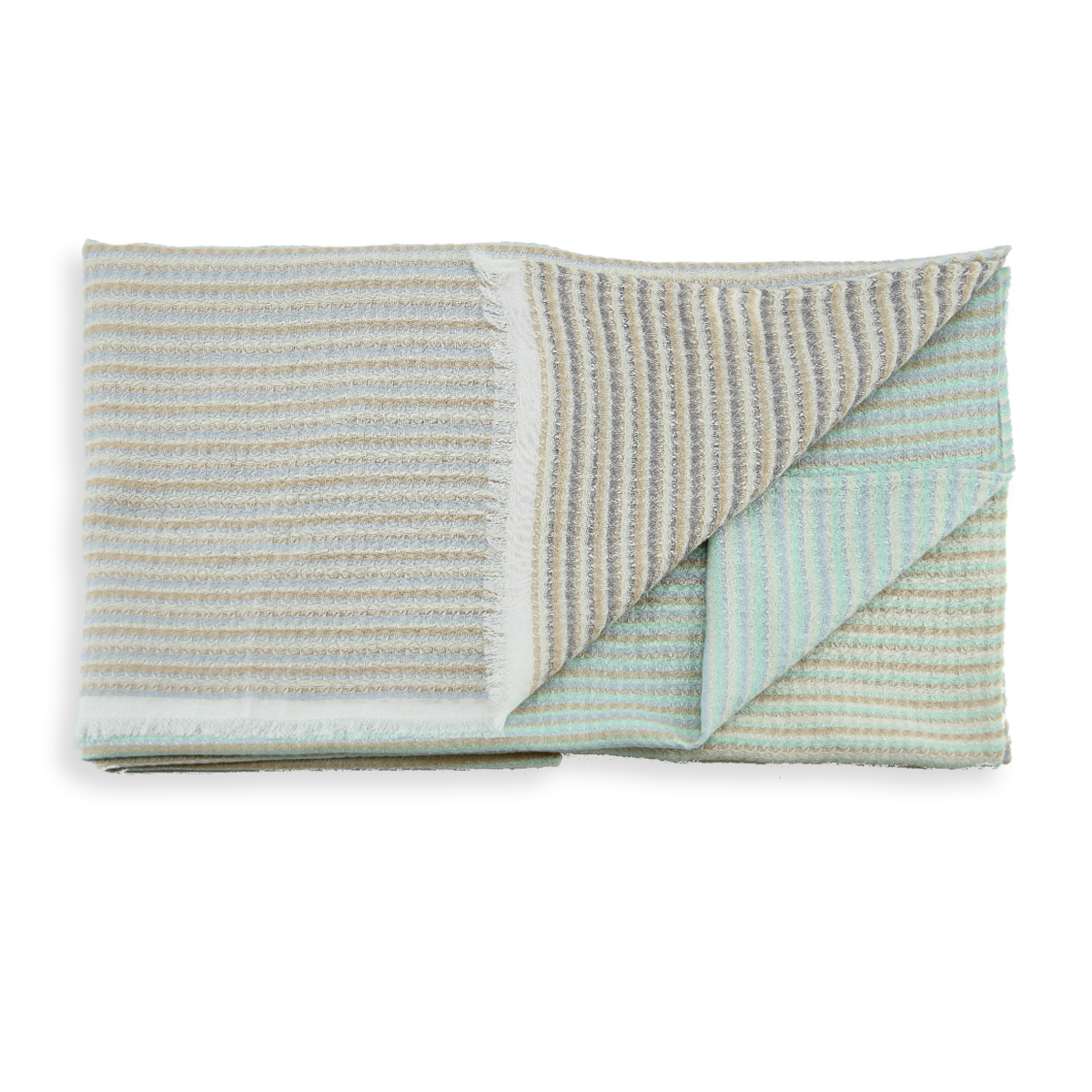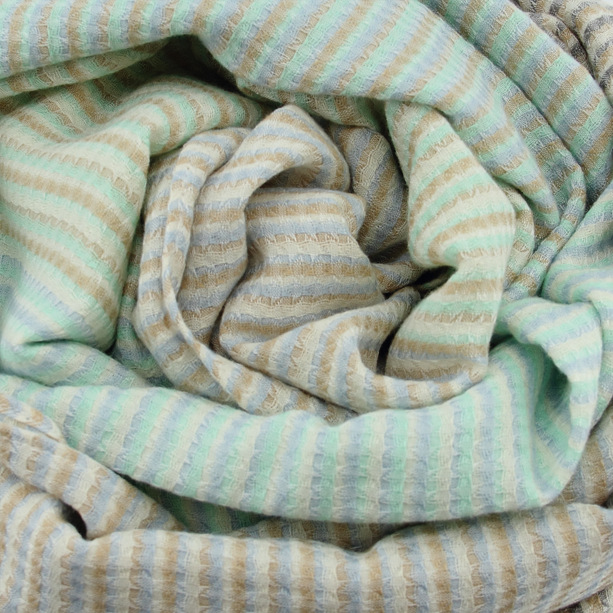 Pour améliorer en plus le touché de cette étole, nous avons assouplis les fibres après le tissage par un lavage spécialement étudié pour adoucir le tissu et accentuer sa résistance.