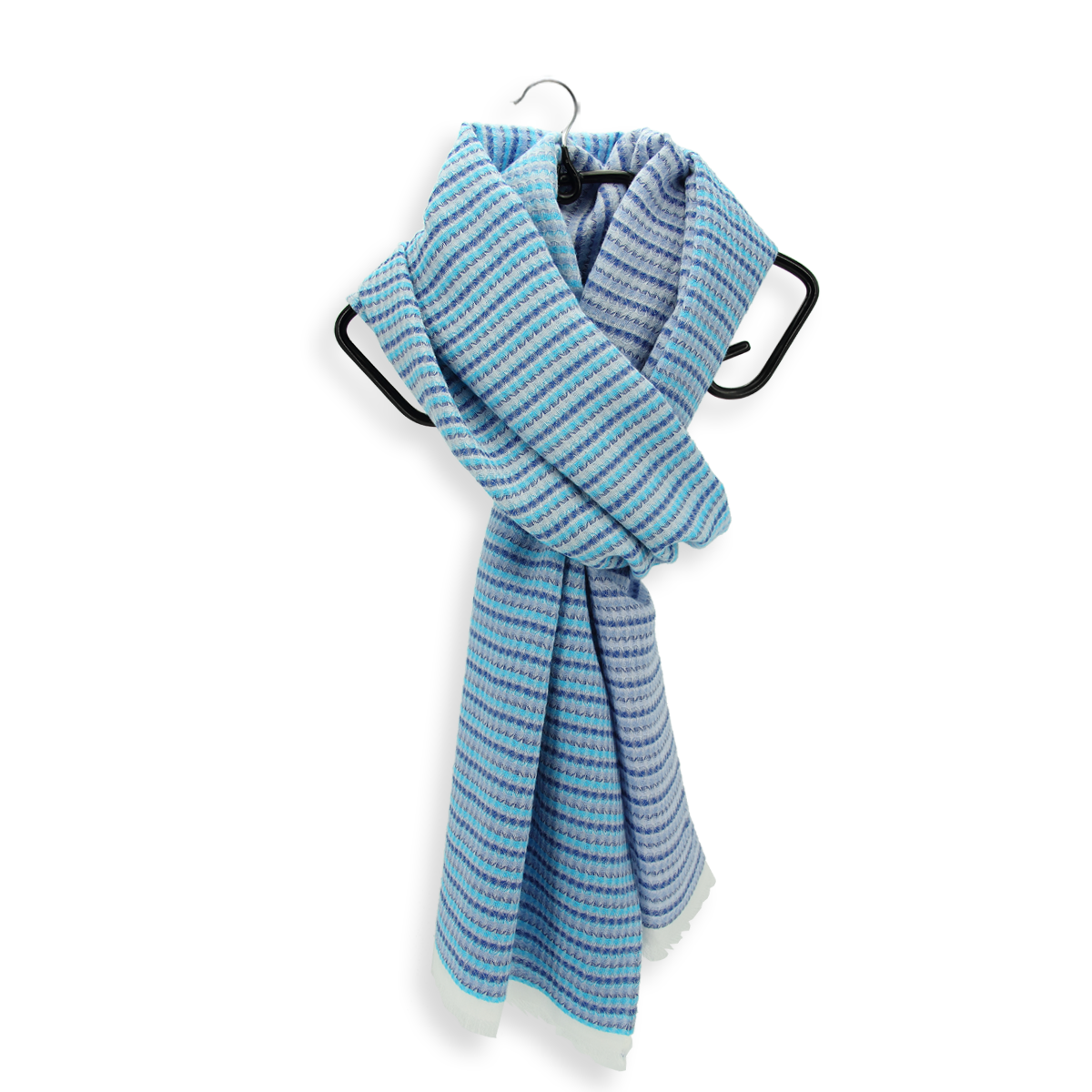 Echarpe style chèche en matière naturelle très douce coton et modal. Des fines rayures dans les camaïeux de bleus lumineux agrémentent ce chèche à porter au quotidien. Parfait pour les femmes aussi bien que pour les hommes. Très belles finitions avec petites franges en base et ourlets fins sur les longueurs. Un beau cadeau pour un anniversaire, la fête des pères ou la fête des mères fabriqué en France !