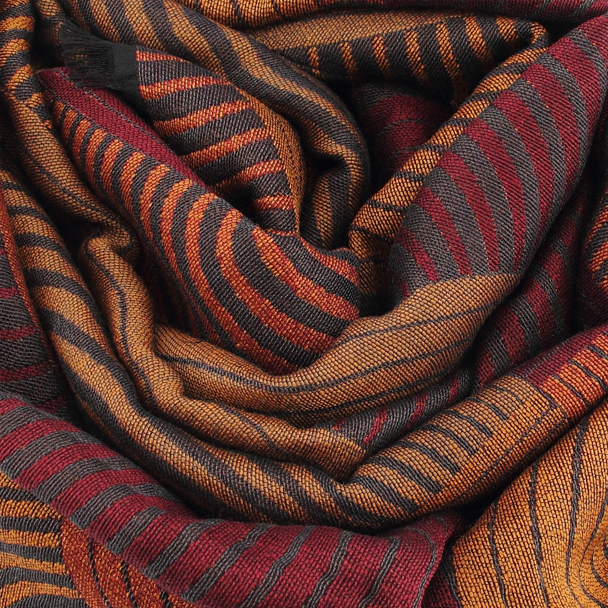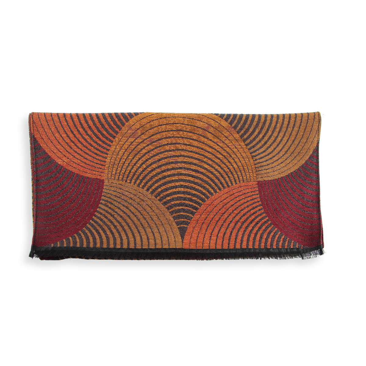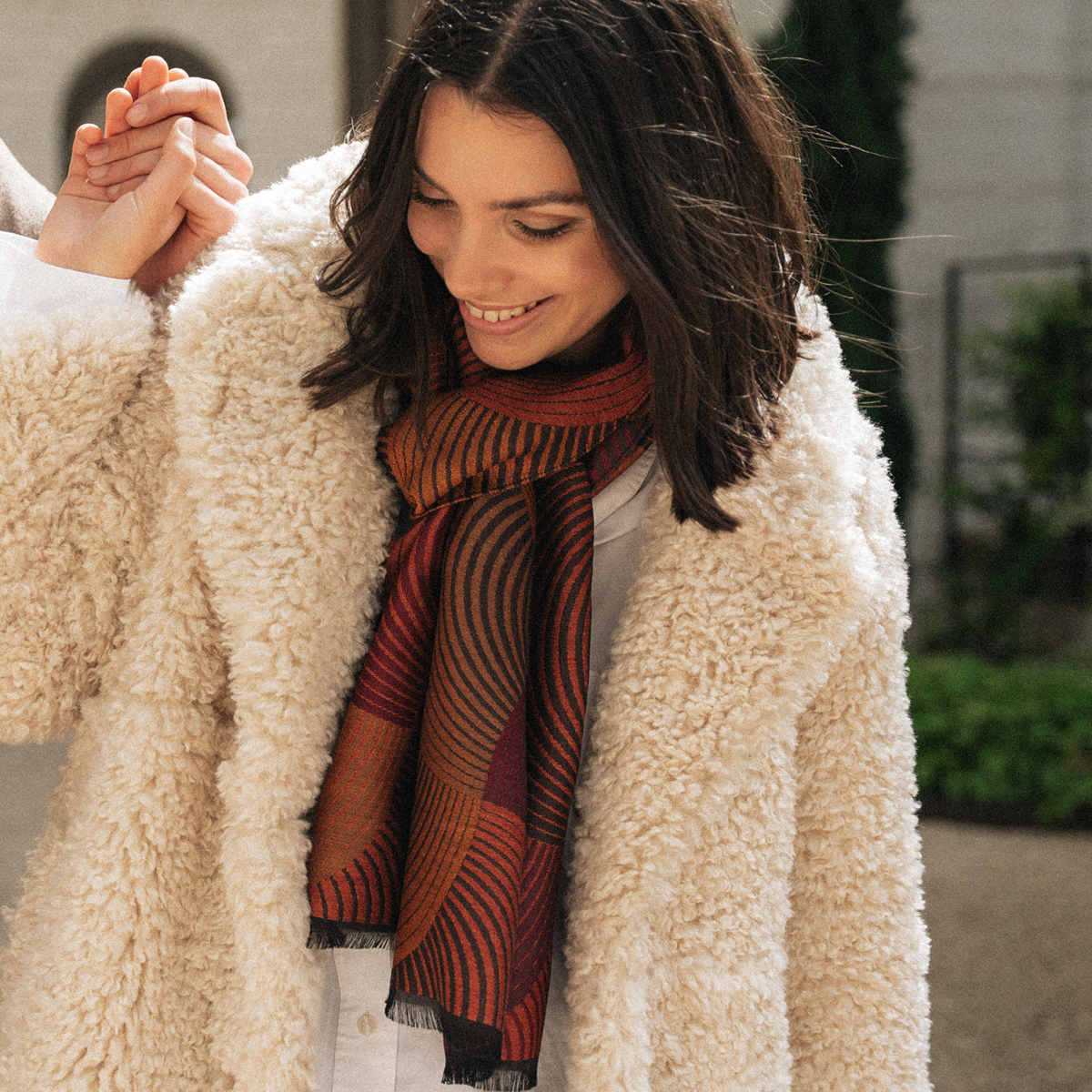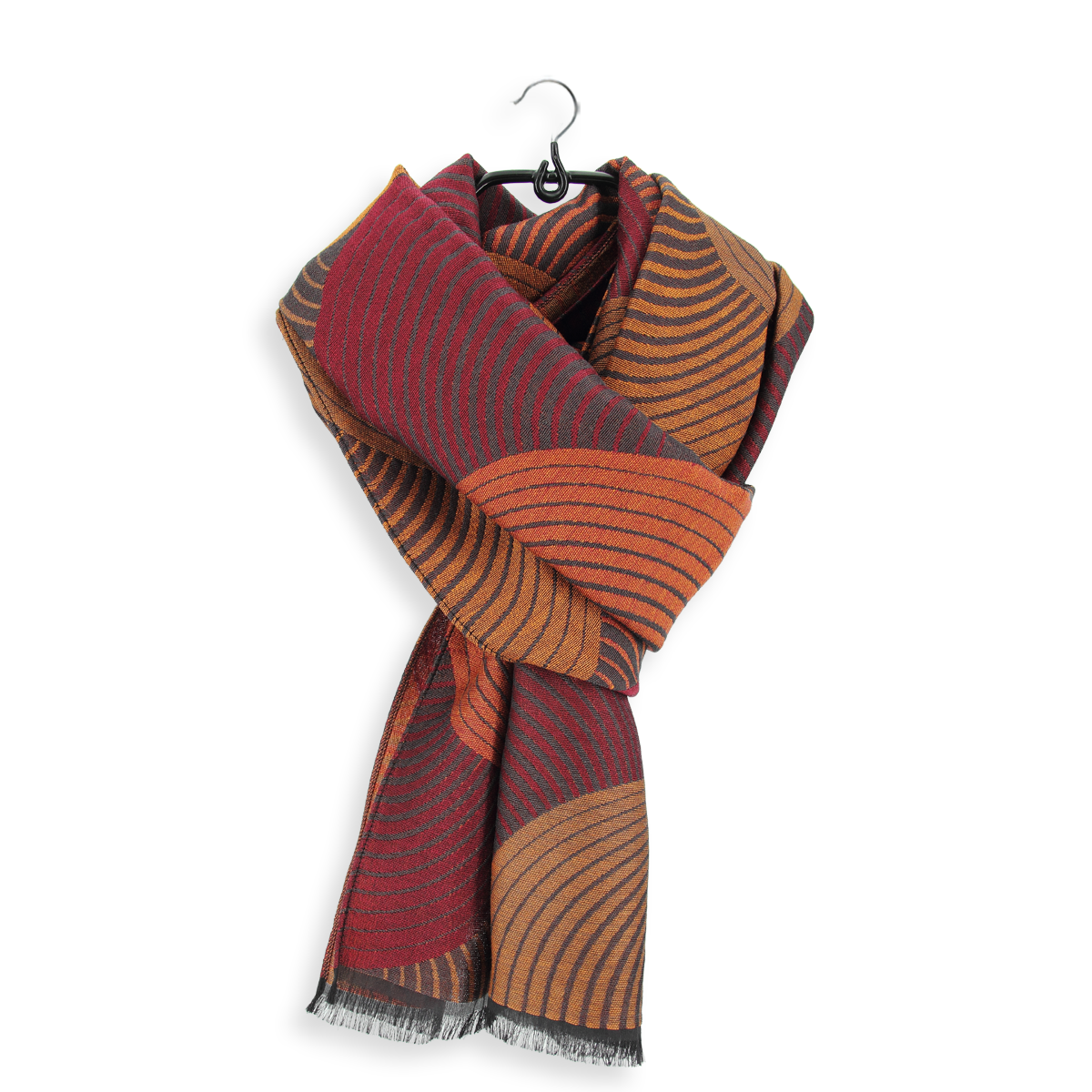 Inspiré des années 70, et de la mode Hippie, le motif psychédéliques choisi, est composé de cercles imbriqués les uns dans les autres pour aboutir à un effet visuel original tout en restant sage dans le choix des coloris : classique avec du marron, ocre, orange et bordeaux. Un motif original signée La Fabrique d’écharpe.