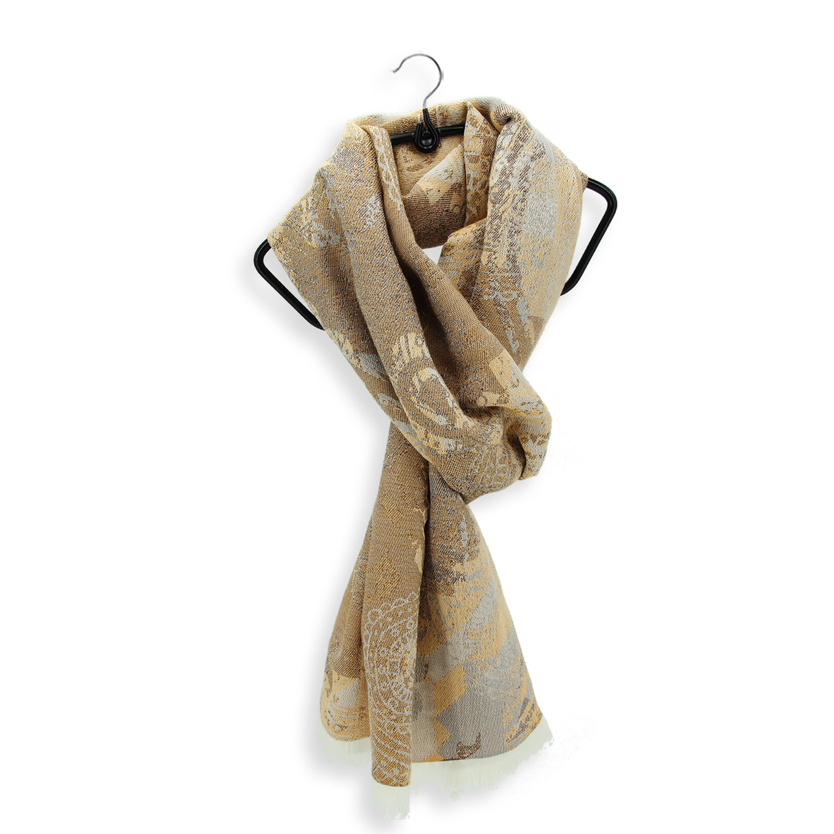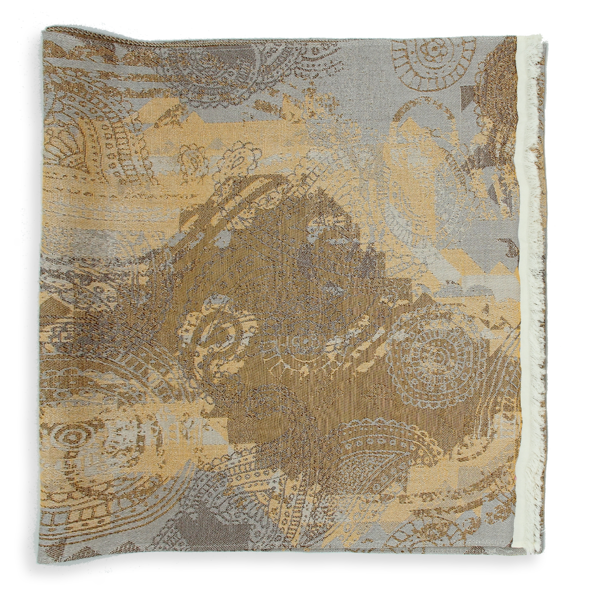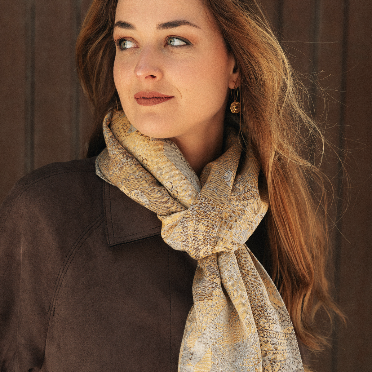 Cette écharpe a été tissée sur nos métiers Jacquard, technique mis au point par le Lyonnais Joseph Marie Jacquard en 1801, premier système mécanique programmable avec cartes perforées. C’est l’entrecroisement de fils de chaine et de fils de trame suivant un dessin qui se répète. Grace aux évolutions, nos métiers à tisser sont maintenant gérés électroniquement pour une meilleure rapidité et une qualité exceptionnelle. Nous suivons l’évolution des progrès techniques afin de rester à la pointe du modernisme. Nous avons réalisé cette écharpe dans la plus pure tradition du tissage jacquard, pour un résultat parfait grâce à un savoir-faire transmis de génération en génération depuis 1880.
