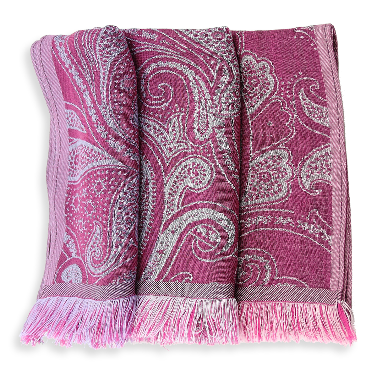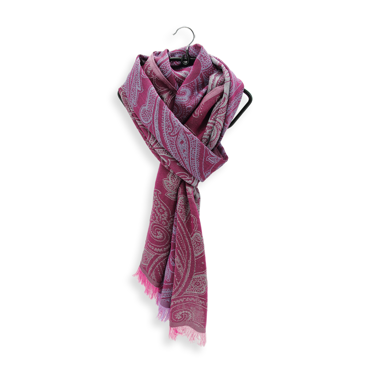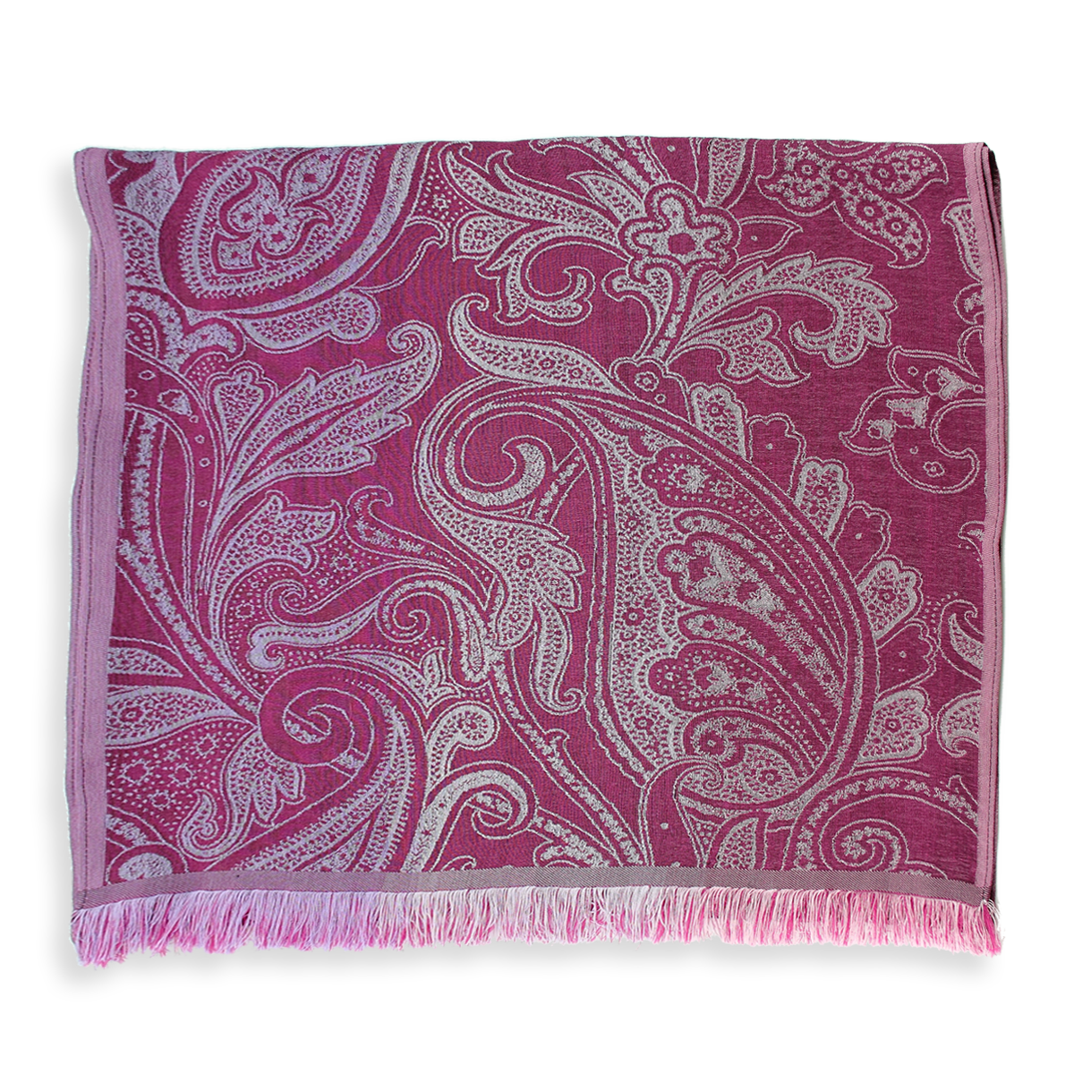 De la Perse antique à la mode moderne, le motif cachemire a traversé les âges. Ils ont été beaucoup utilisés sur les étoffes lyonnaises à partir du 19ème siècle. Inspiré de ces Cachemires, Paisley, et autres arabesques, les décors beaux et affirmés de cette écharpe se dessinent sur un fond rose magenta. Les palmes et fleurs s’étalent en prune, rouge et gris argent, pour apporter douceur et raffinement.