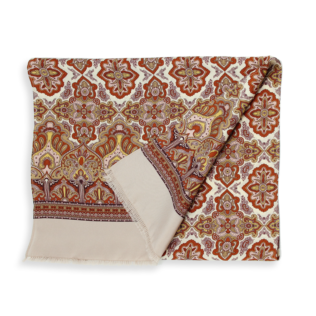 Echarpe pour homme 100%soie BIO labellisée GOTS. La soie certifiée GOTS n’apparait que depuis peu sur le marché, La Fabrique d’écharpe soucieuse de l’environnement vous propose aujourd’hui ce foulard en soie garantissant les normes GOTS c’est-à-dire le respect et l’amélioration des conditions de travail, l’utilisation de fibres biologiques et le procédé de production respectant l’environnement. Le motif en palmes et cachemires est colorié en camaïeu de marron, roux, beige, écru avec une touche lumineuse de jaune paille. Des finitions soignées, petites franges en base et ourlets fins sur les longueurs. Le toucher est doux et confortable, un foulard éco-responsable, fabrication française.