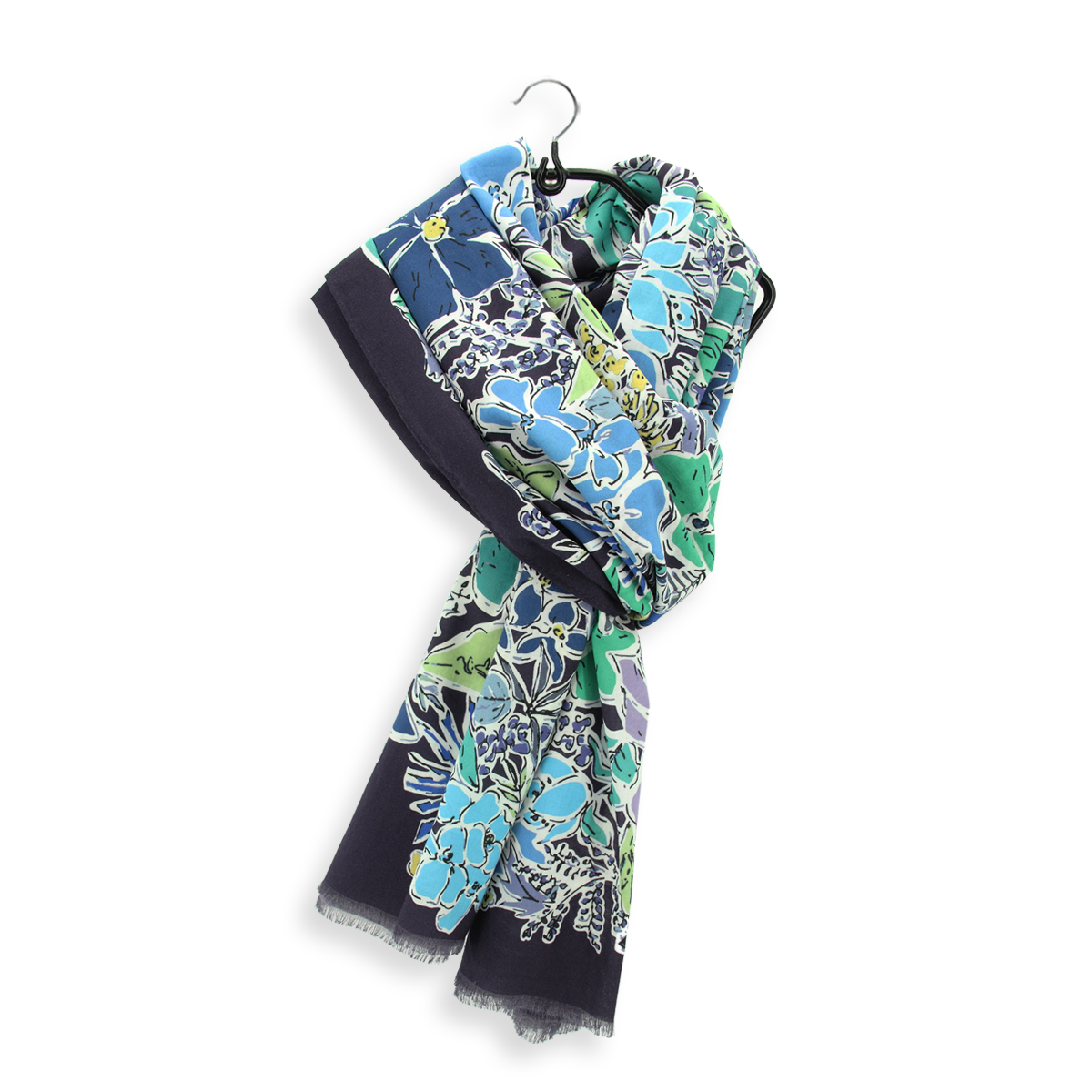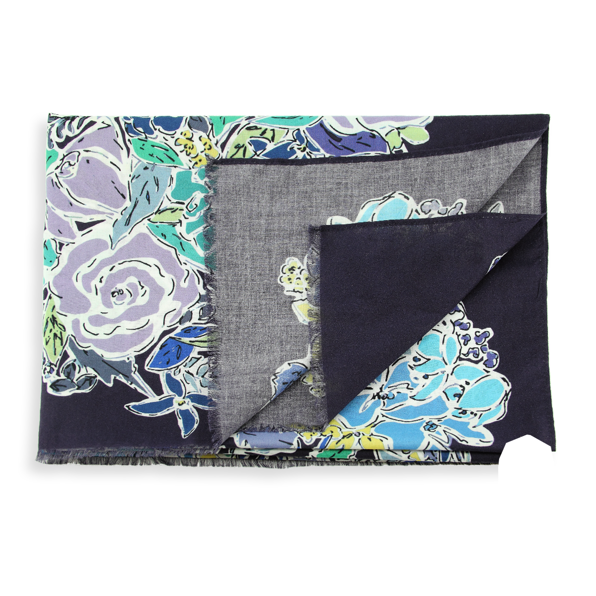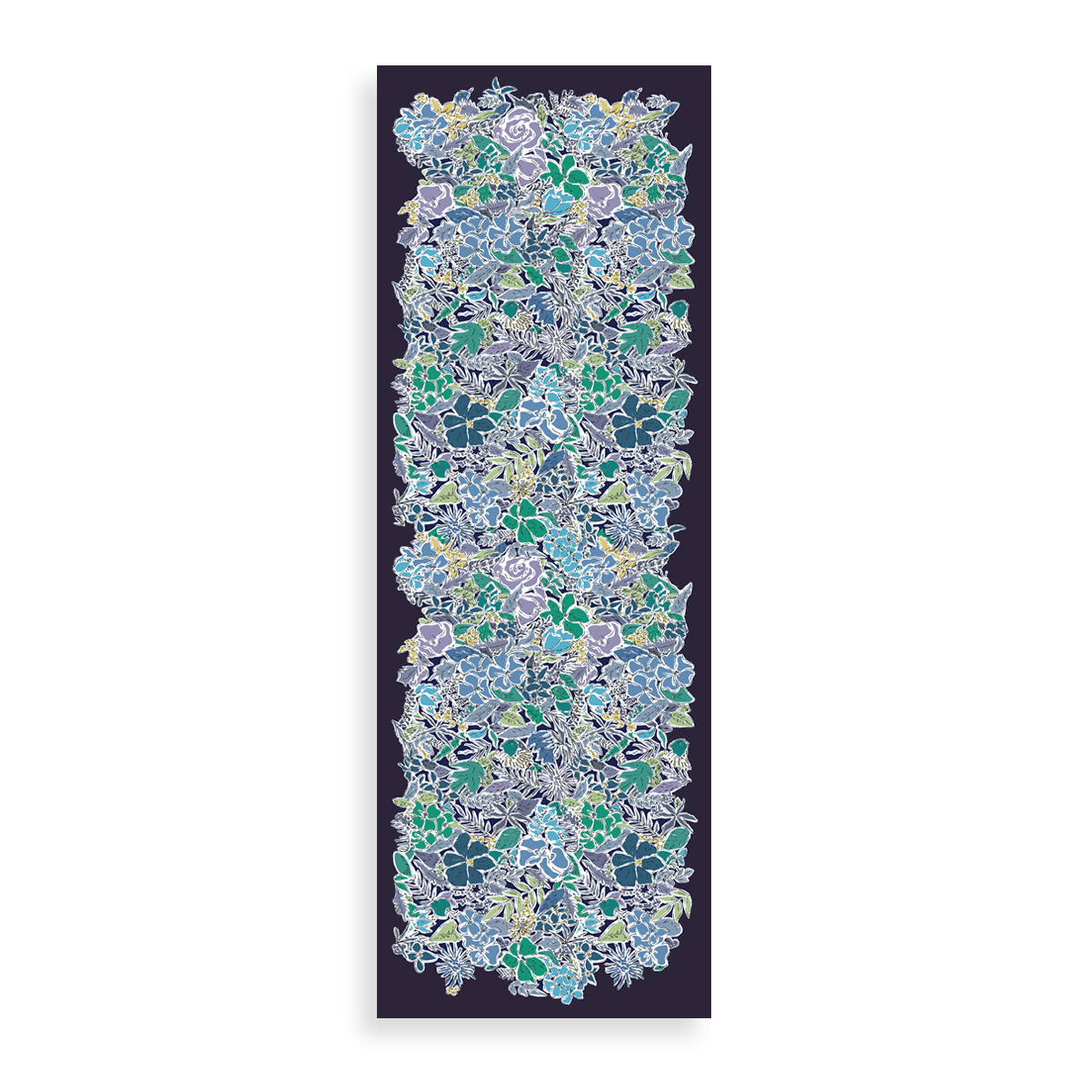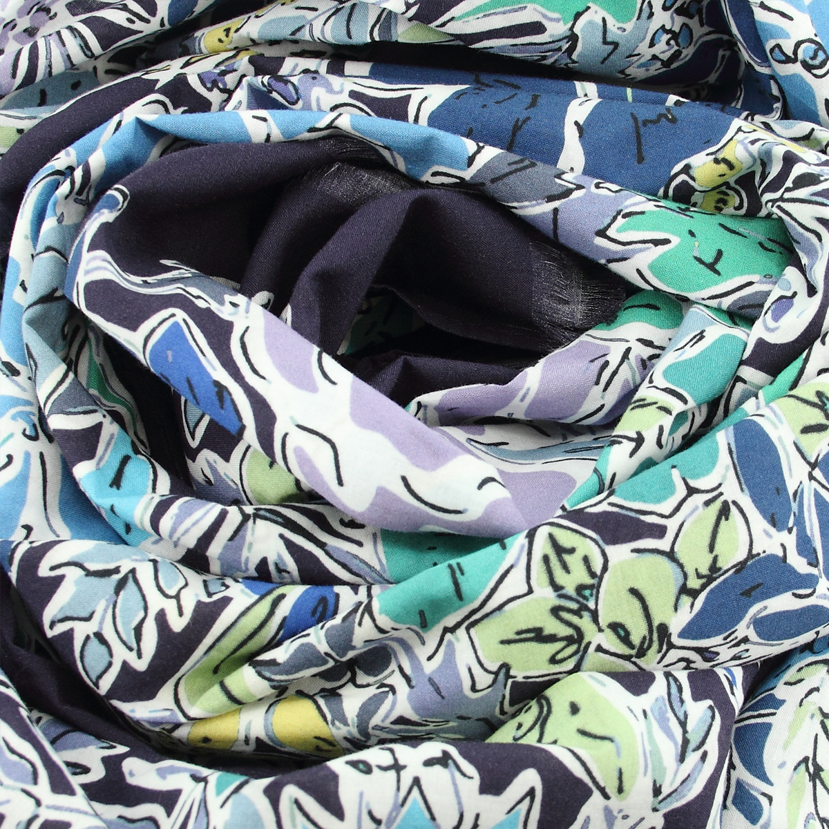 Un motif floral effet peinture au coloris lumineux de turquoise, d'anis, de royal et de ciel, le tout relevé par des coups de crayon noir qui soulignent chaque élément. Cet ensemble de fleurs et de feuilles est posé sur un fond bleu marine.