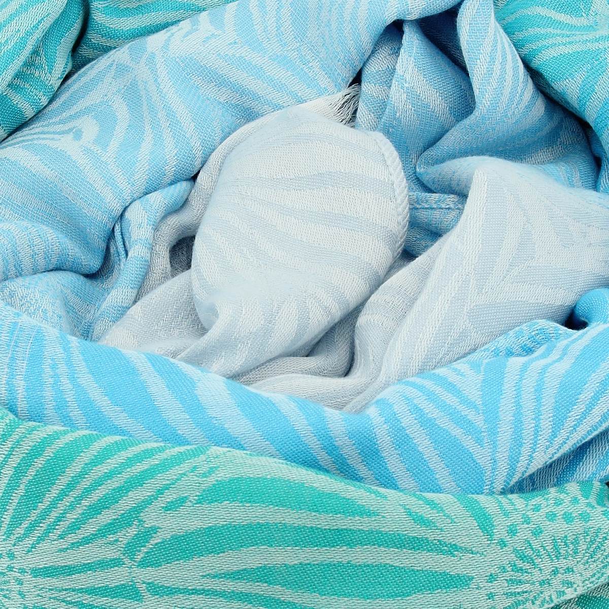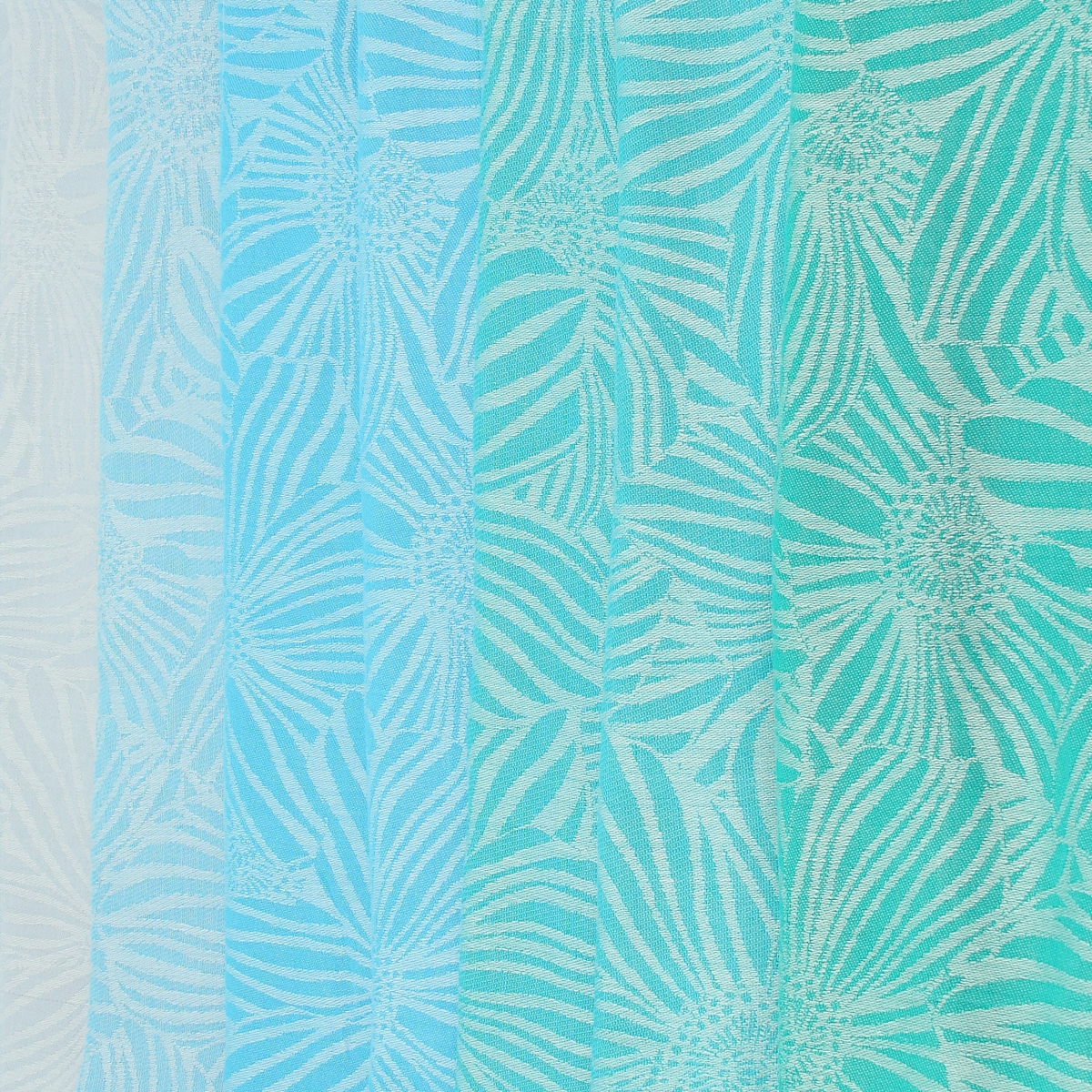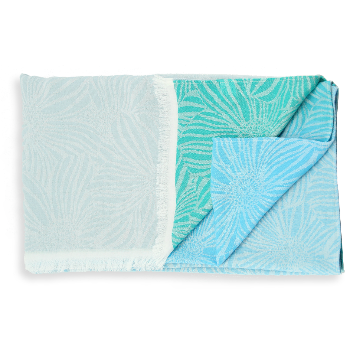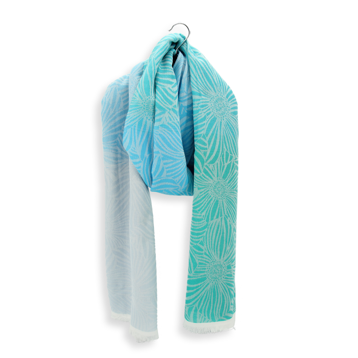 Inspiré des gerbéras, la styliste redessine ces grandes fleurs décoratives, elles s’entremêlent et se superposent pour apporter richesse et abondance. Le coloriage est en dégradé sur la hauteur de l’étole commençant par le bleu jean, puis du bleu ciel pour finir par un turquoise. Des coloris éclatants très printaniers ont été choisis pour illuminer vos looks.