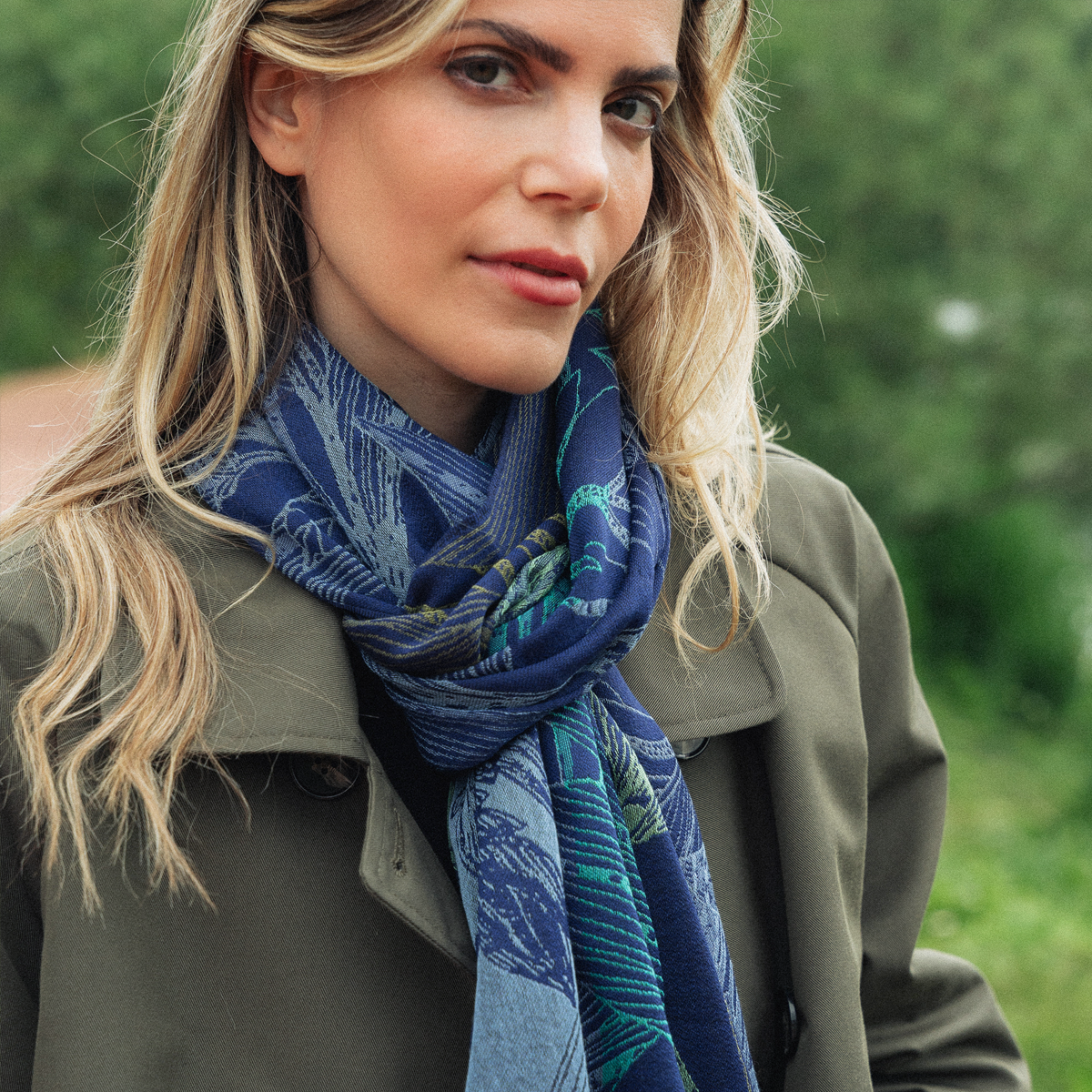 Inspiré du style Art déco, un style harmonieux et sensuel simplifiant les formes vous séduira. Les branchages fleuris apportent une touche poétique, dessinés sur un fond marine encre, ils se déclinent tout au long de l’étole en bleu clair, turquoise et absinthe. Une variante lumineuse inspirée de la haute-couture