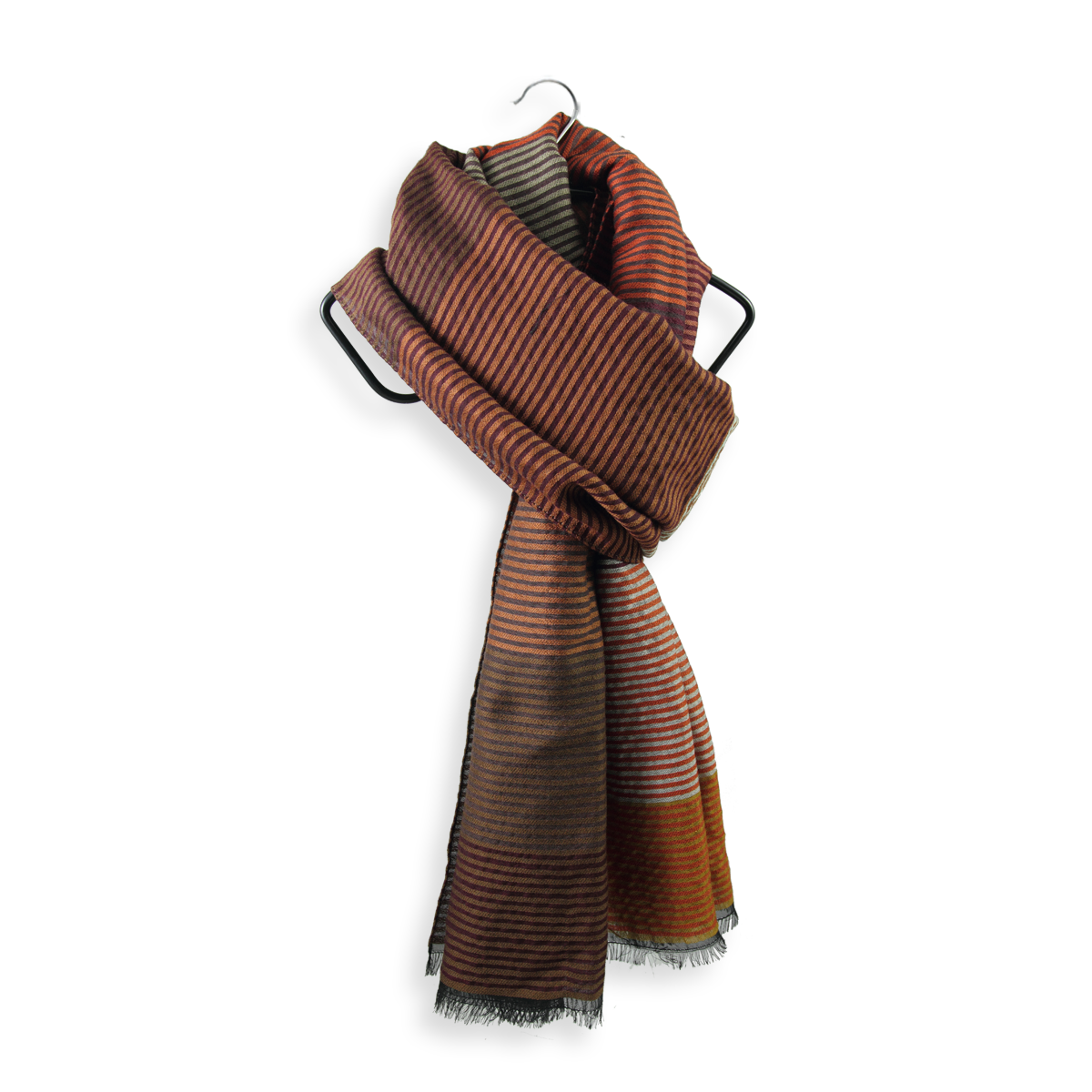 Pour cette écharpe, nous avons voulu créer un design intemporel mais avec une touche d'exception qui se démarquerait vraiment. Ce concept, réalisé en rayures basiques, permet à l'écharpe d'être assortie à presque toutes les tenues, elle est totalement polyvalente. L'assortiment de 12 fils différents de laine et de coton tissés ensemble lui confère un aspect très unique dans des tons de brun, d'ocre, de beige et de cuir. La combinaison de ces matières avec la soie confère à l'écharpe un aspect très vivant. La Kaleida est en fait le motif le plus compliqué à tisser sur nos métiers à tisser.