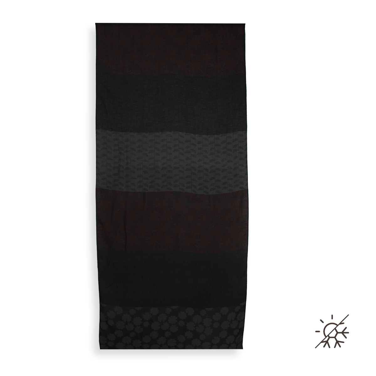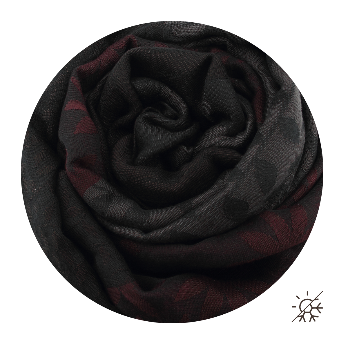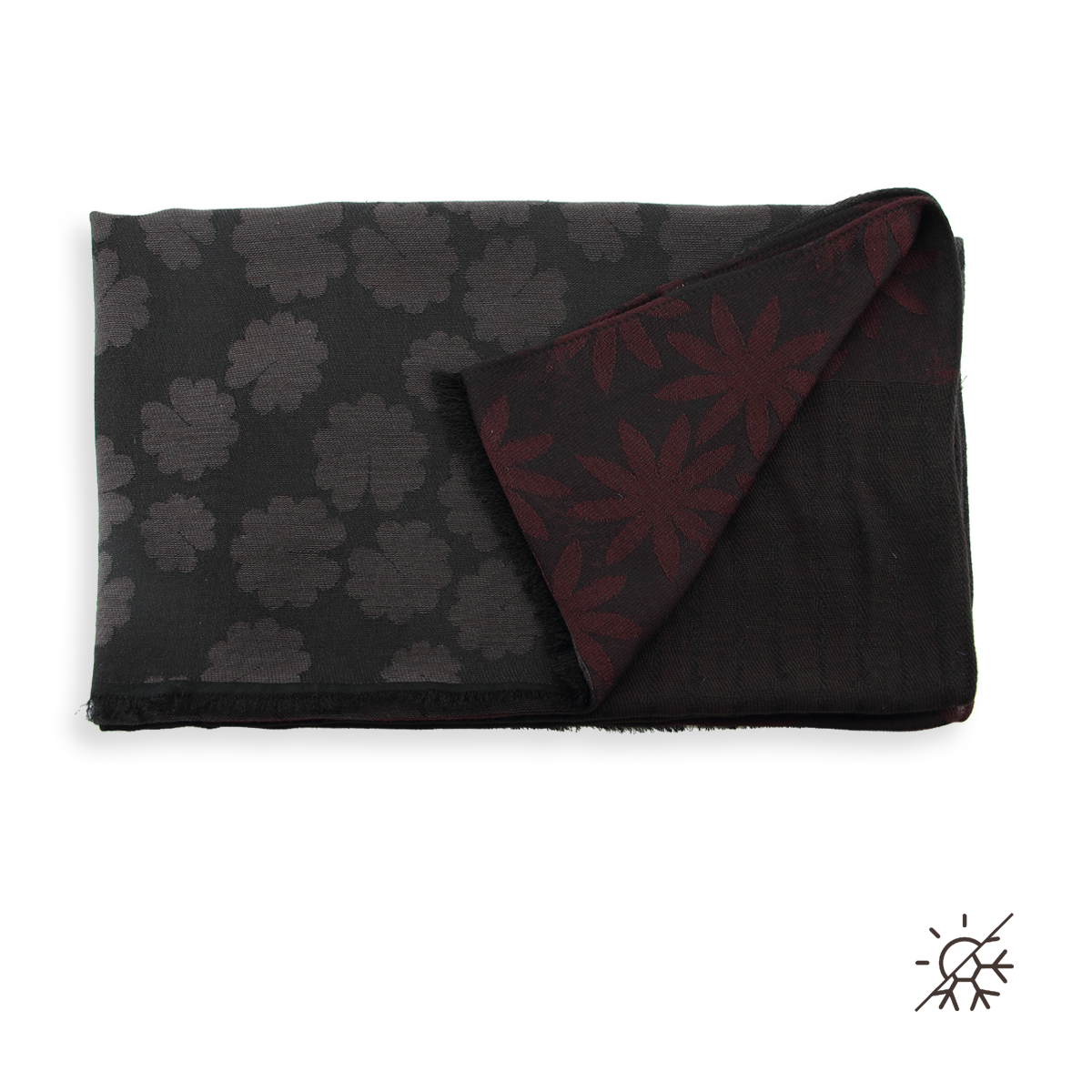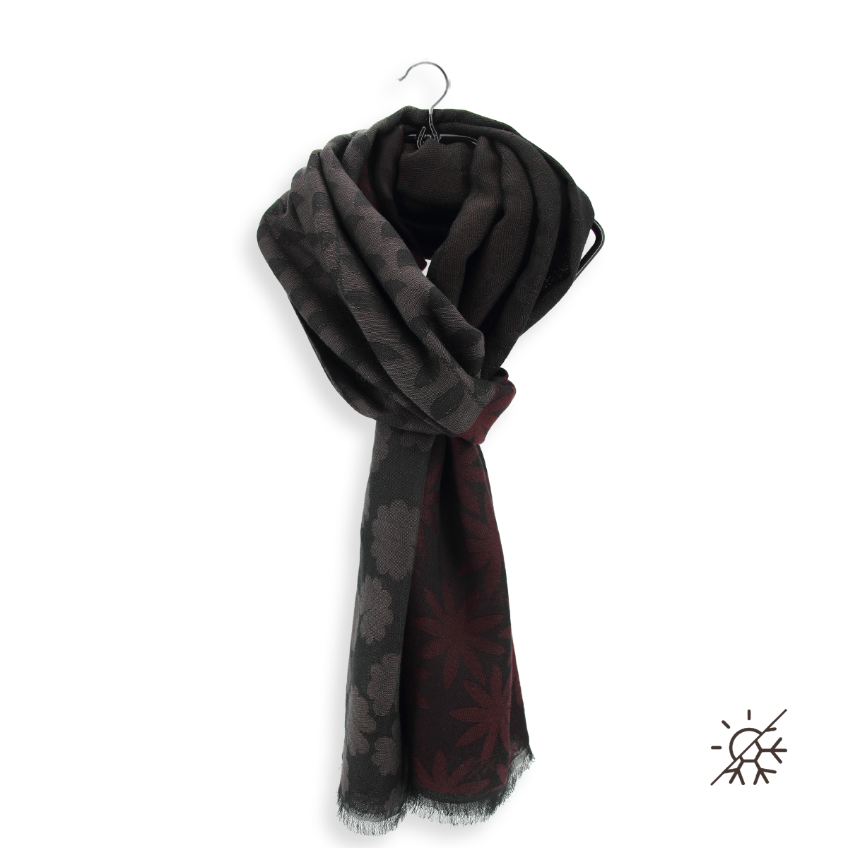 A partir de notre bibliothèque de dessins, nous avons combiné 6 motifs dans le thème fleuri pour réaliser cette étole. Fleurs, pétales, tiges et bambous sont les dessins répartis de façon égale sur toute la longueur de notre grande écharpe « Jeannette ». Chacun ayant son coloris, le résultat est innovant et créatif pour mettre en valeur votre style. Ici, le visuel de couleur est entre le noir et le marron, en passant par des touches de rouge bordeaux.