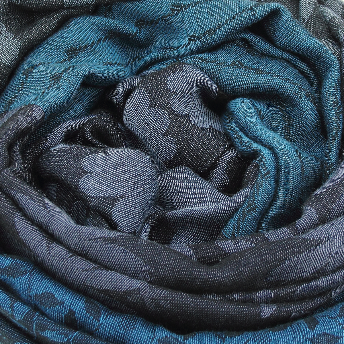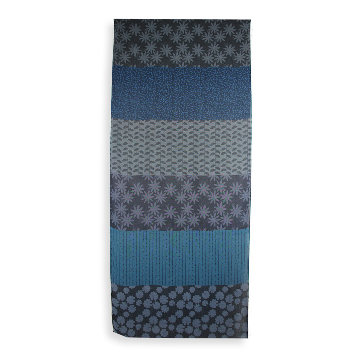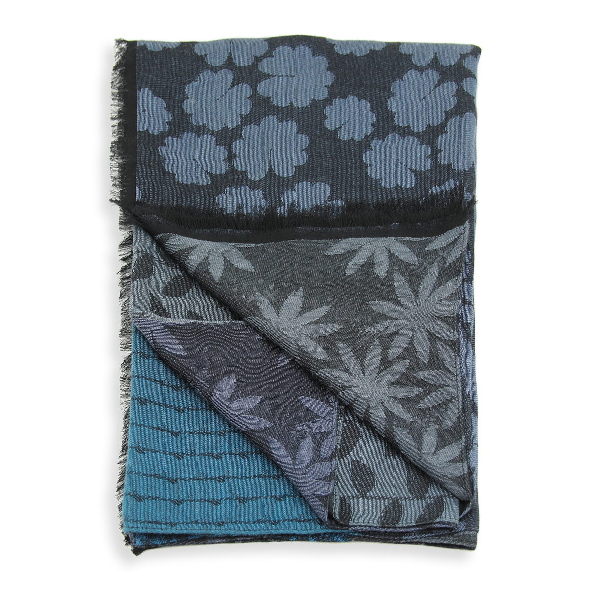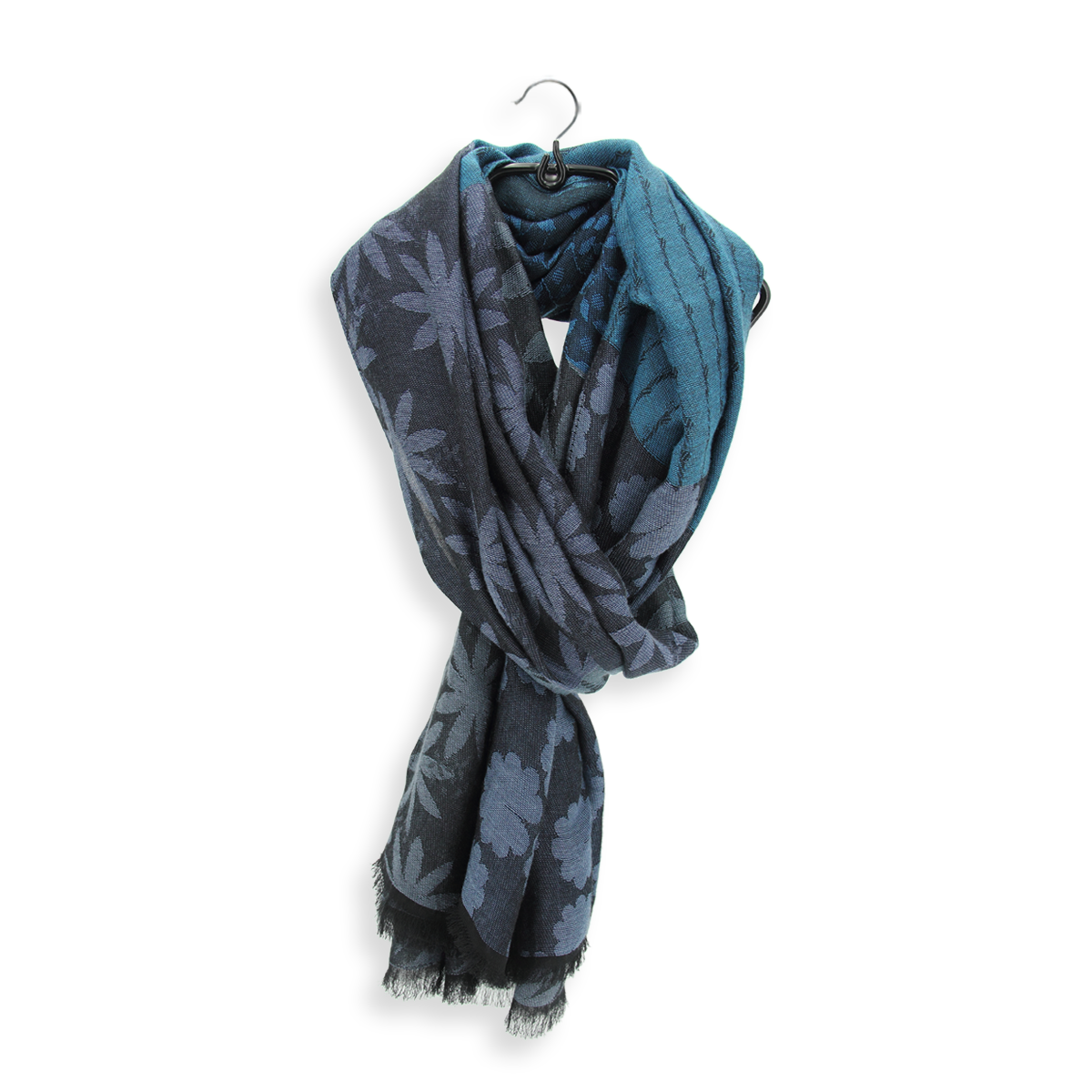 A partir de notre bibliothèque de dessins, nous avons combiné 6 motifs dans le thème fleuri pour réaliser cette étole. Fleurs, pétales, tiges et bambous sont les dessins répartis de façon égale sur toute la longueur de notre grande écharpe « Jeannette ». Chacun ayant son coloris, le résultat est innovant et créatif pour mettre en valeur votre style. Ici, le visuel de couleur est entre le bleu jean et le bleu marine, en passant par des touches grises.