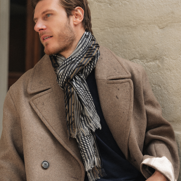 Une écharpe en soie et laine sur un manteau uni