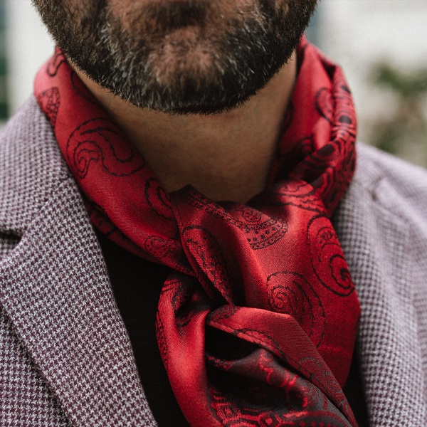 Aujourd’hui, pour un usage quotidien, on choisit un foulard soie homme rectangulaire 45×160/170cm et on le noue façon “Ascot”. Le plus facile, c’est de faire un nœud simple sous le menton et de placer les deux pans à l’intérieur du col de chemise. Motifs cachemire, géométrique ou mini motifs cravates conviennent très bien, privilégiez des coloris marquants si vous voulez éclairer votre silhouette. Découvrez nos modèles “Elégance” et “Ombré” du 100% Soie Bio Gots, en impression numérique. et notre modèle “Charles” rouge 100% soie en tissage Jacquard.