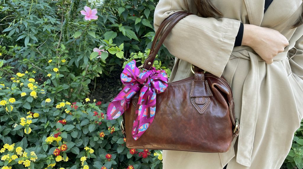le petit carré ou foulard “hôtesse”, on l’enroule au plus serré autour du cou et on réalise un petit nœud serré sur le devant. Pour réaliser une attache comme un ruban sur une queue de cheval ou un chignon bas, un petit carré 45x45cm apportera une touche soyeuse de couleur, le détail mode à votre coiffure. Faites un nœud avec votre foulard sur l’anse de votre sac à main, c’est le détail qui personnalisera votre look.